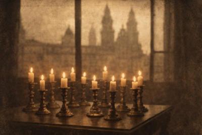 Las farolas de gas iluminaban las calles con esa luz amarillenta que hacía que todo pareciera un sueño. A lo lejos, la silueta de la catedral se recortaba contra el cielo oscurecido. Un peregrino solitario cruzó la plaza, el bordón golpeando las piedras.