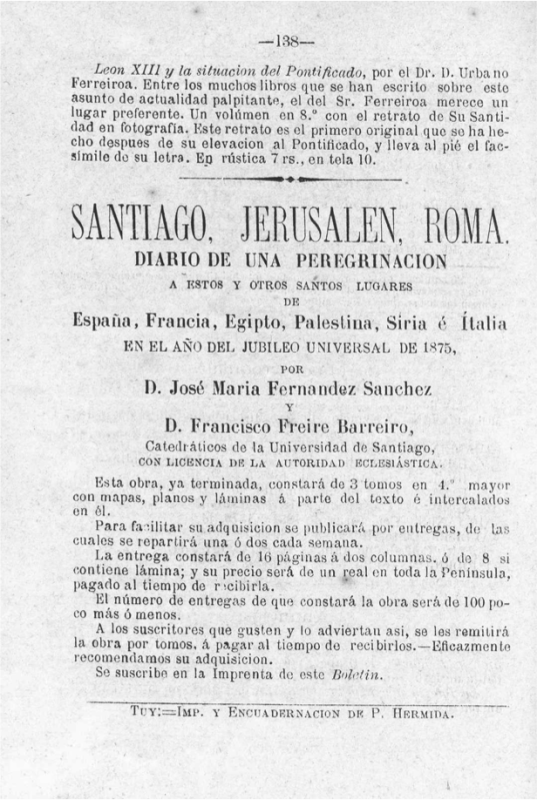 La vida extraordinaria de Francisco Freire Barreiro, abuelo de Pilar Platas Freire. Hijo de labradores, llegó a ser Decano de la Facultad de Medicina de Santiago, peregrinó a Jerusalén en el siglo XIX y certificó la autenticidad de los huesos del Apóstol Santiago para el Papa. (60 páginas)